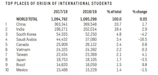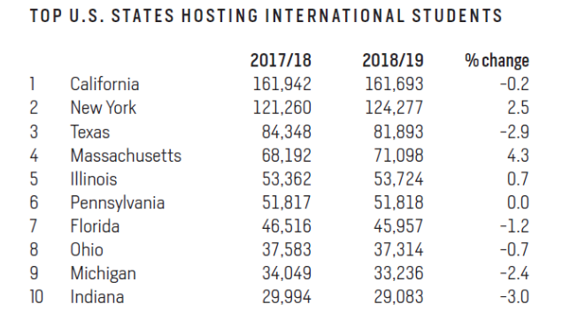 根据最新《美国开放门户报告》,在2018到2019学年中,在美国学习的国际学生人数达到有史以来的最高109余万人,其中中国学生数量达到了约37万人。其中,吸引留学生最多的州是加州、纽约州、德克萨斯州。