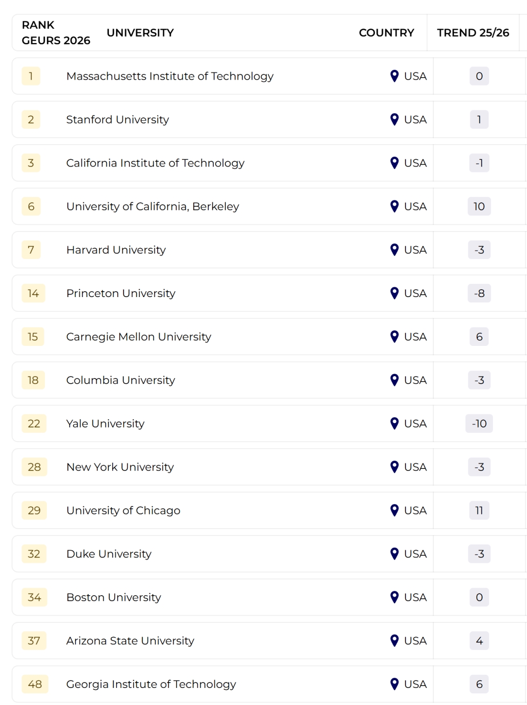 Top 3包揽:麻省理工学院(MIT)连续蝉联第1,斯坦福大学第2,加州理工学院第3。