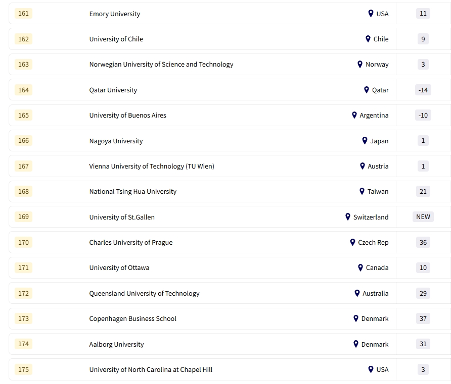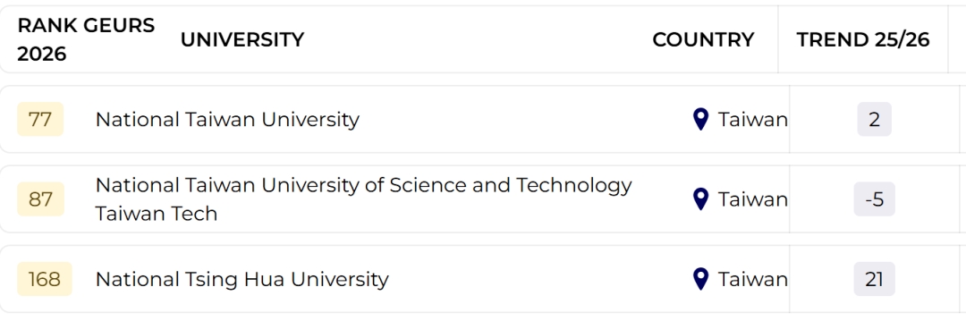 台湾大学(第77,上升2位)、台湾科技大学(第87)及台湾清华大学(第168,上升21位)表现亮眼。