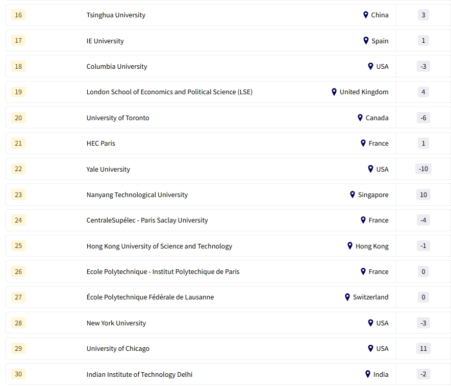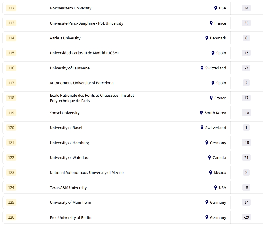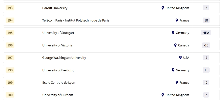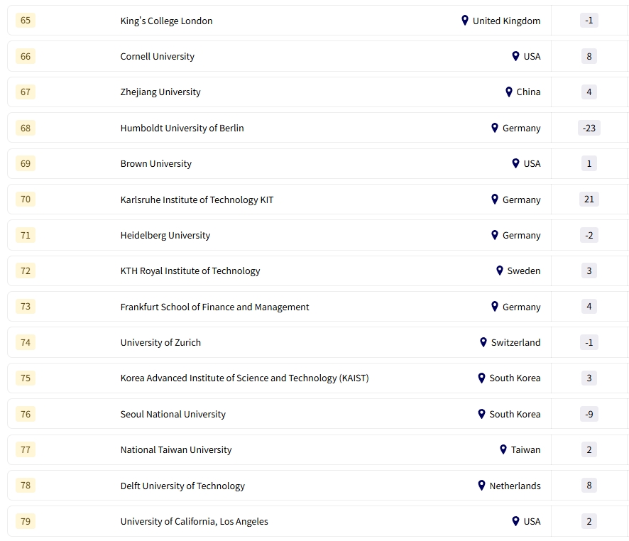 德国的柏林工业大学、卡尔斯鲁厄理工学院、亚琛工业大学、法兰克福金融管理学院排名均有提升。