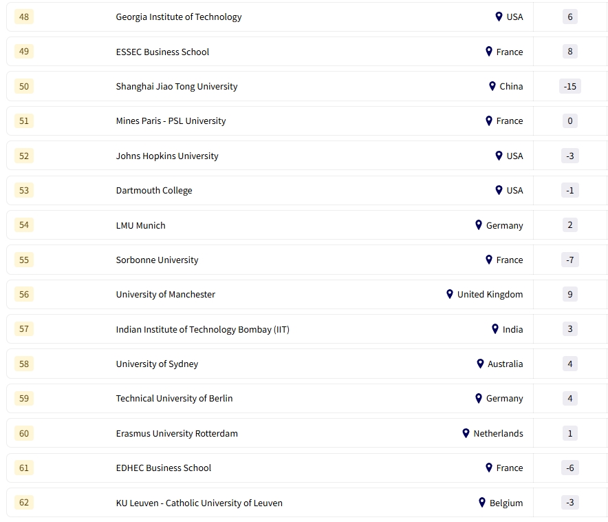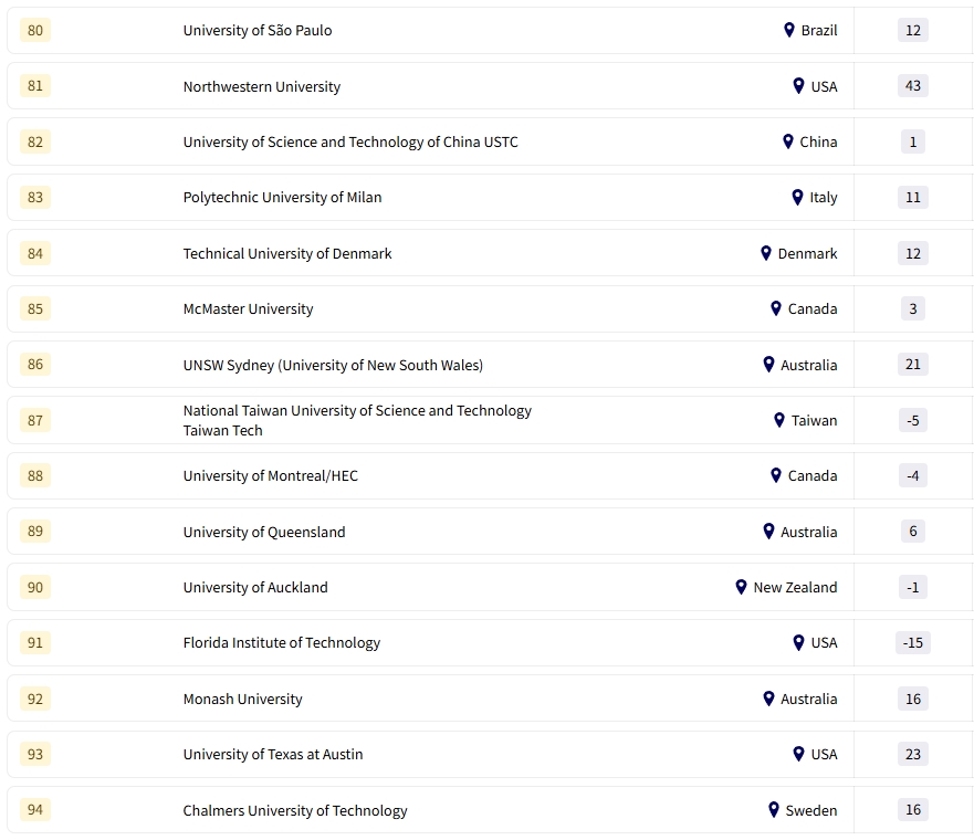 复旦大学(第41,上升5位)、上海交通大学(第50,下降15位)、浙江大学(第67,上升4位)、中国科学技术大学(第82)跻身前100。