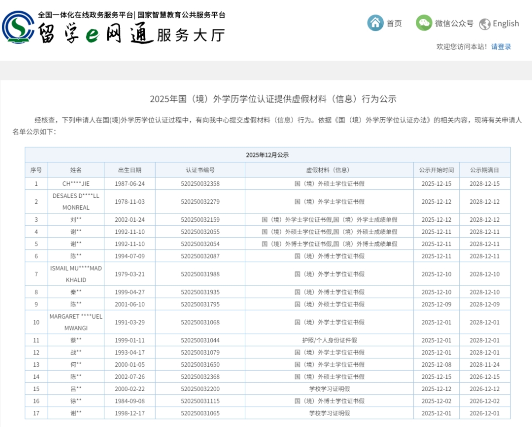 截至12月15日,已有多名申请者因在学历认证环节提交虚假、伪造或无效材料而被公开公示,公示期最长可达三年。