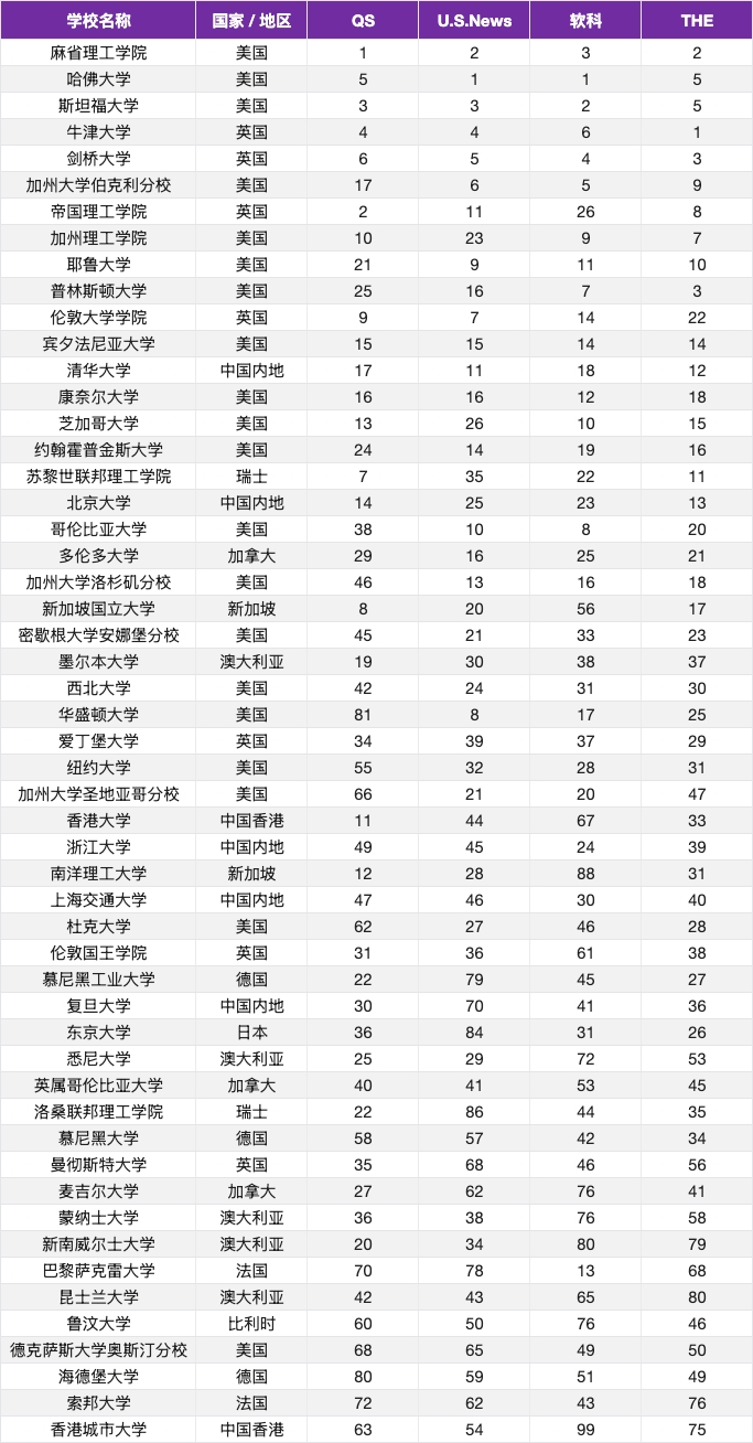 根据统计,能在 QS、U.S.News、THE、软科这四大榜单中,统统稳坐世界前 100 席位、实现全榜单顶尖的院校,仅 53 所!如下: