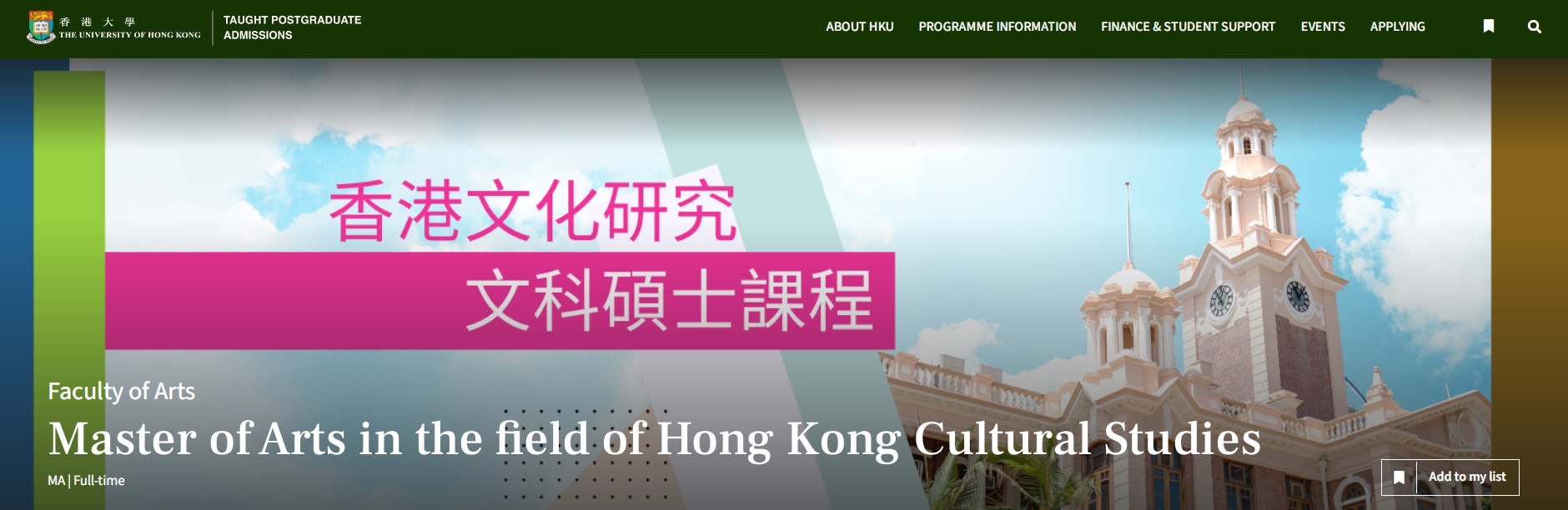 香港文化研究文学硕士(MA)是一个跨学科课程,旨在为学生提供有关香港的人文学科知识,包括香港的语言、文学、文化、社会、创意产业、电影和媒体,并以问题为导向的方法进行学术训练,以了解香港在大湾区中的作用及其在全球背景下与中国的联系。